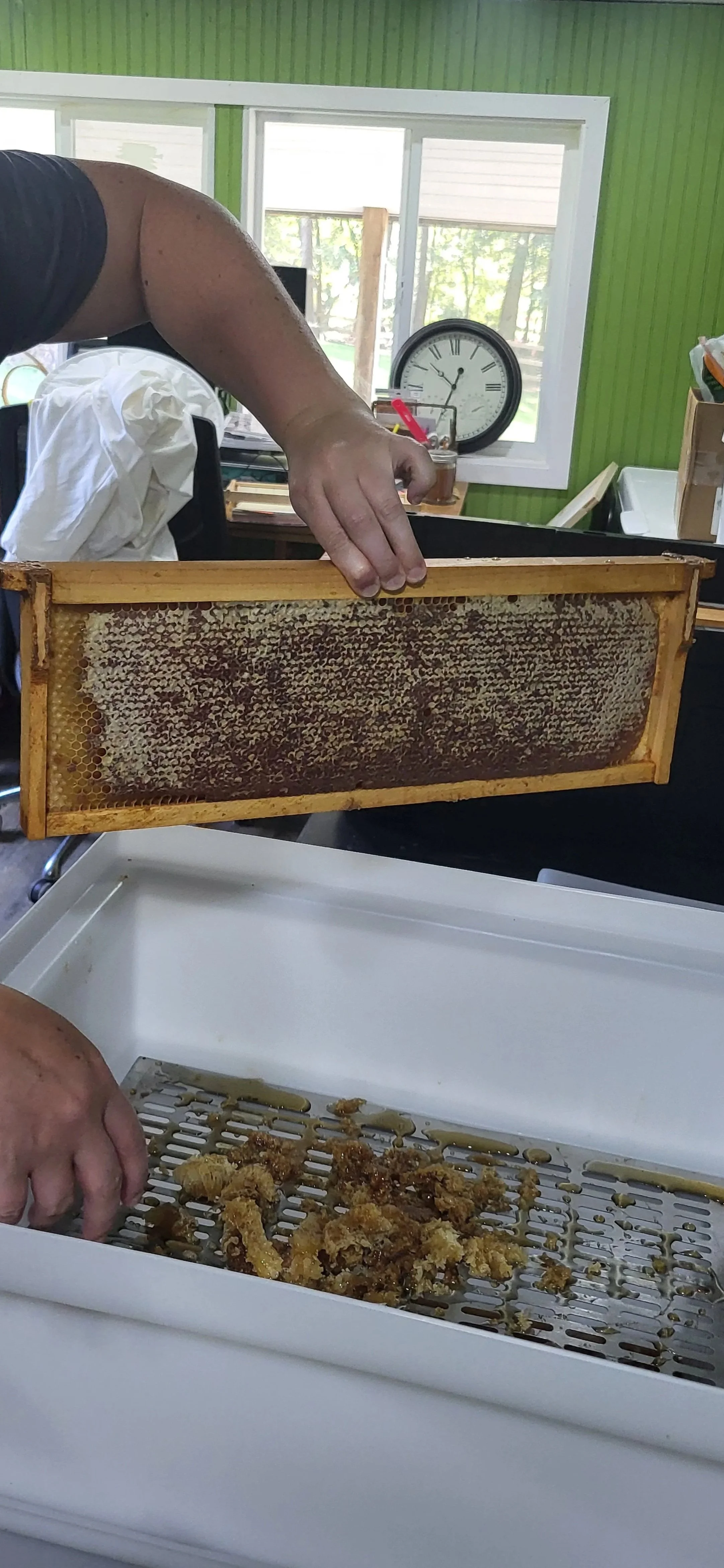 As Beekeepers, we have the privilege of harvesting honey 2 times a year. Usually in late July and October, but that really varies based on the temperatures and state of the bee frames. This year in late July we got a total of 10 frames off of 2 hives. They rest of the frames were not capped yet (they need to have white wax covering 95% of the frames for us to consider it capped, or ready to harvest) so we left them for the later harvest. Uncapped honey is not at the ideal moisture level yet and will likely crystalize quickly in the jar. The bees know when it is ready, so we just follow their lead and only take the capped honey.