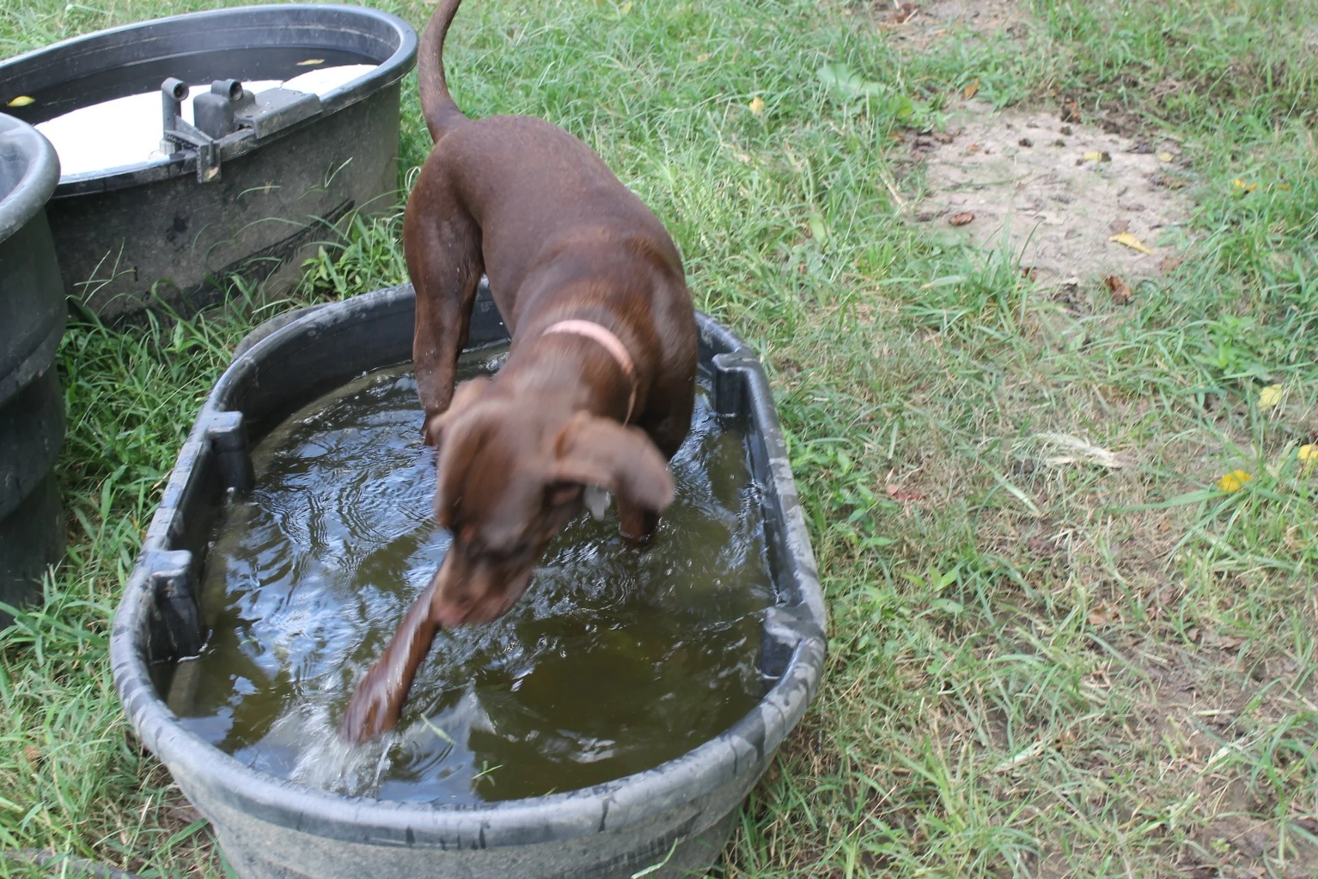 My name is Hazel and I was brought to the farm to help create more puppies when I am big enough. I was born July 3, 2024. I have beautiful yellow eyes that seem to peer straight into your soul-the younger humans call them creepy. I love my friend Diesel and would really like to get to hang out with the chickens and goats more, but the humans don’t really trust me out there alone. My favorite activity is destroying sticks, tree limbs, and dogs toys. I lick everyone I meet and love new people! I also love water and jump in the stock tanks every chance I get.